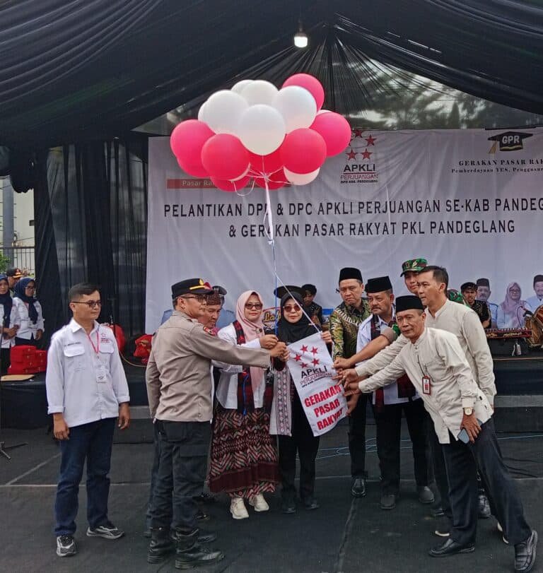 Pandeglang Banten,_ Ditengah pendulum paket kebijakan stimulus ekonomi 8+4+5, Balon Gerakan Pasar Rakyat (GPR) menjulang ke langit dilepas Bupati Pandeglang Raden Dewi Setiani. Hal tersebut dilakukan pada Gebyar Gerakan Pasar Rakyat PKL UMKM dan Pelantikan DPD/DPC APKLI-P Se-Pandeglang Banten di Alun-Alun Pandeglang, Jumat, 19/9/2025.